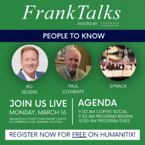 FrankTalks is presented monthly with support of Renasant Bank, as well as Franklin Tomorrow’s sustaining partners: Atmos Energy, PAPE-DAWSON, and Williamson Health. Lyon Leadership Group provides coffee for the event.