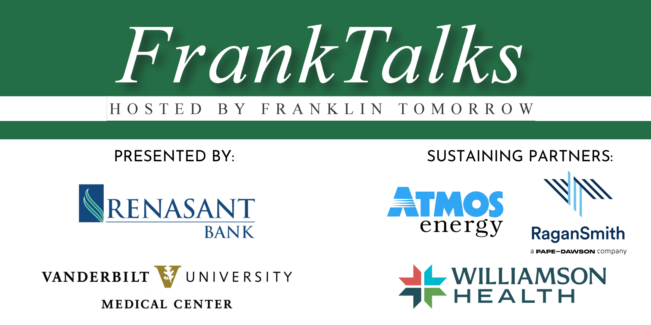 FrankTalks is presented monthly by Renasant Bank and our sustaining partners, Atmos Energy; RaganSmith, A Pape-Dawson Company; and Williamson Health. Thank you to Vanderbilt University Medical Center for their support of this FrankTalks event. Thank you to Lyon Leadership Group, our local McDonald’s franchisee for coffee for the event.