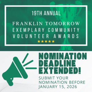 The nomination deadline has been extended until Jan. 15, 2026, for the 19th Annual Franklin Tomorrow Exemplary Community Volunteer Awards, which will be held February 18, 2026, at the Franklin Theatre.