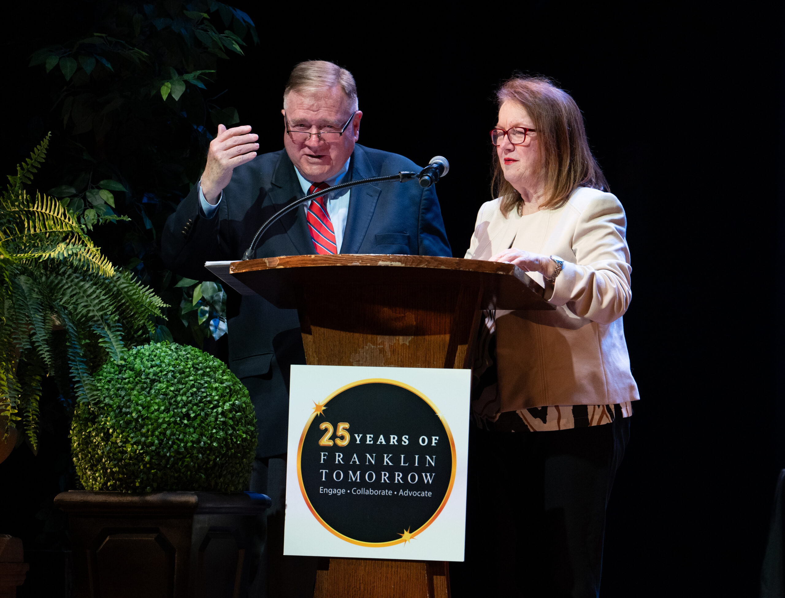 - Tom Lawrence and Mindy Tate speak at Franklin Tomorrow’s 18th annual Volunteer Awards ceremony on Monday, March 24, 2025 at the Franklin Theater.
