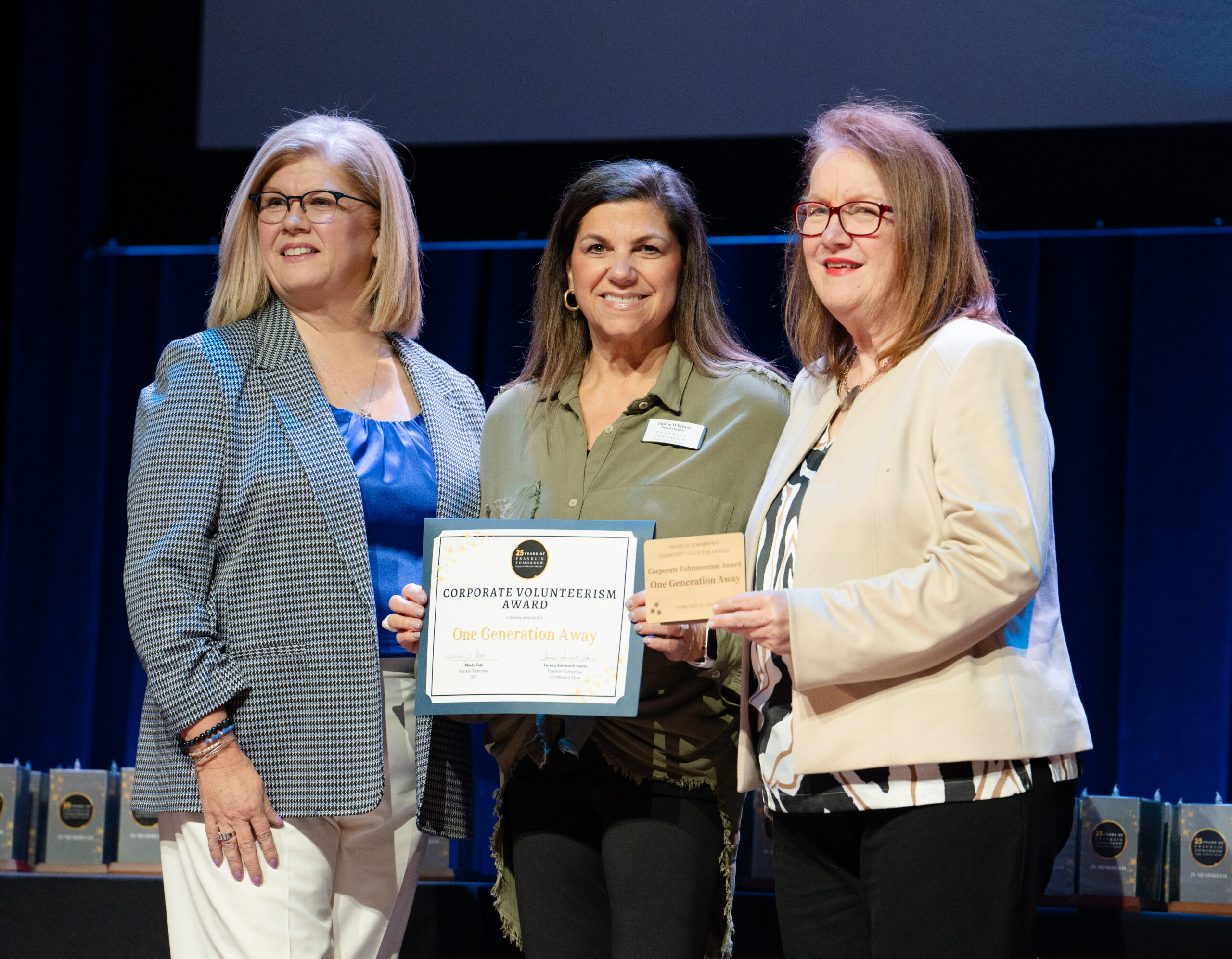 - Teresa Ashworth Harris, Elaine Whitney and Mindy Tate pose for a photo at Franklin Tomorrow’s 18th annual Volunteer Awards ceremony on Monday, March 24, 2025 at the Franklin Theater. Whitney accpeted the Corporate Volunteerism Award on behalf of her organization, OneGenerationAway.