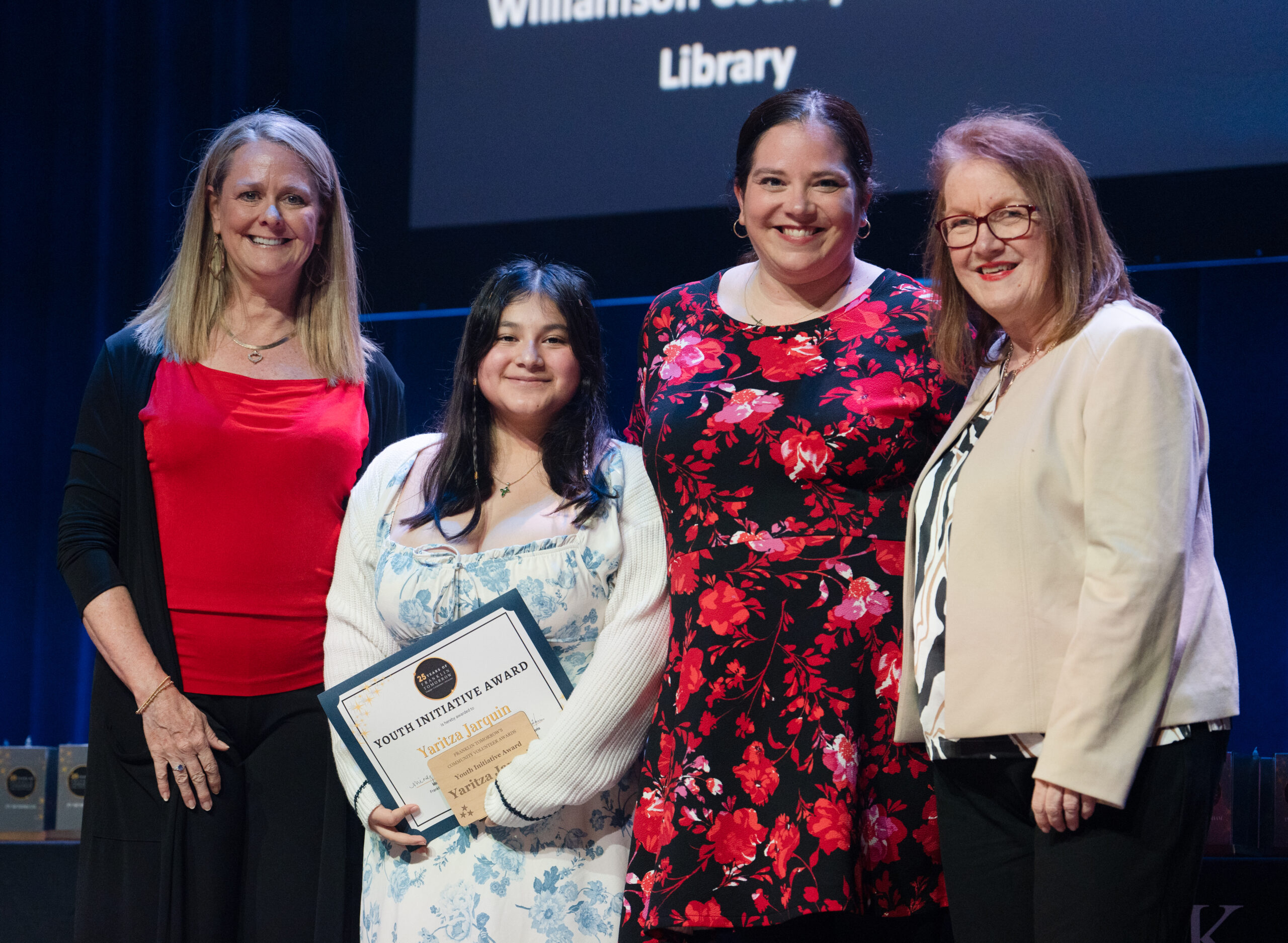 - Yaritza Jarquin (second from left) accepts her Youth Initiative Award at Franklin Tomorrow’s 18th annual Volunteer Awards ceremony on Monday, March 24, 2025 at the Franklin Theater.