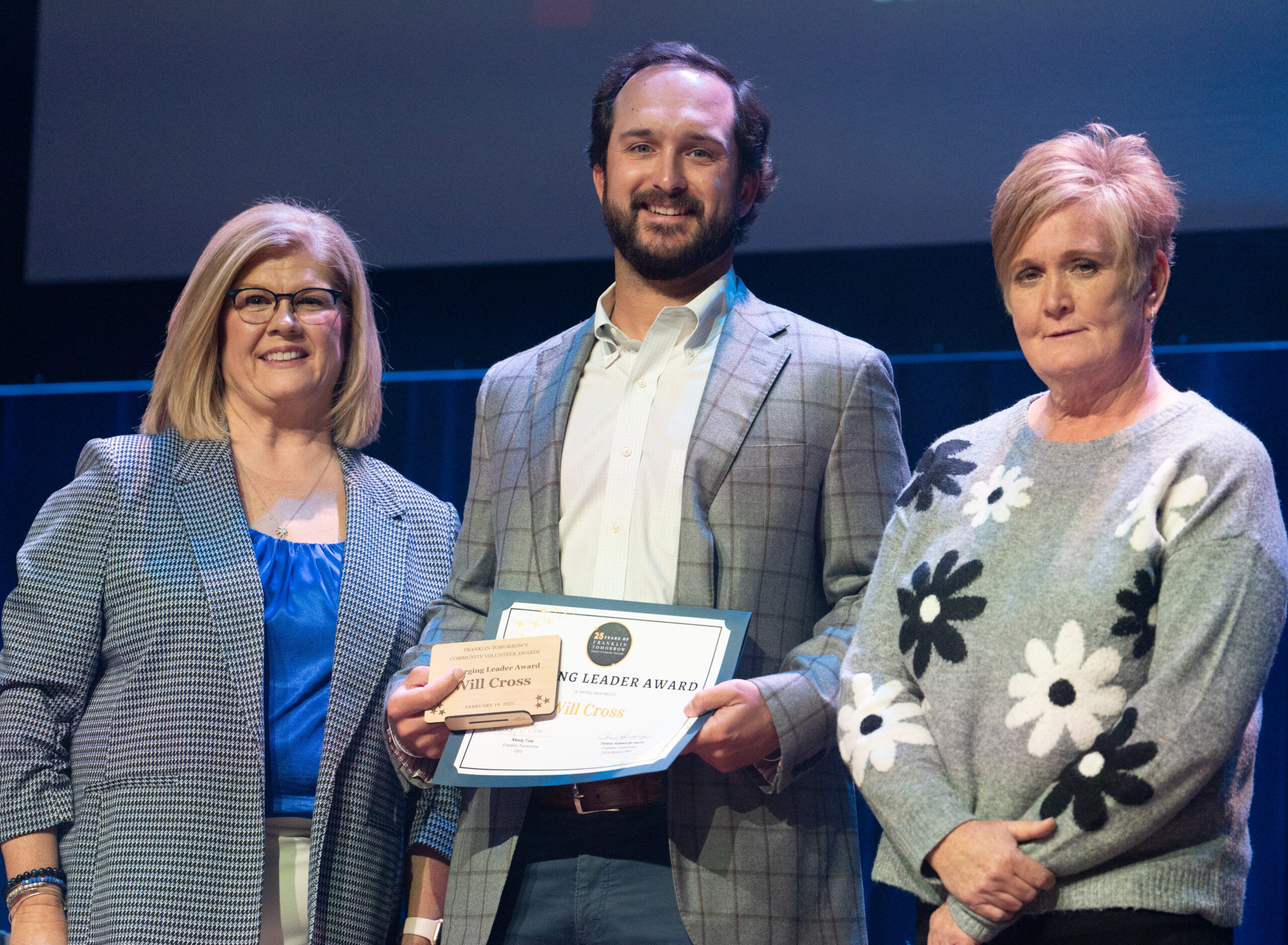 - Teresa Ashworth Harris, Will Cross and Carrie Drury pose for a photo at Franklin Tomorrow’s 18th annual Volunteer Awards ceremony on Monday, March 24, 2025 at the Franklin Theater. Drury nominated Cross for the Emerging Leader Award.