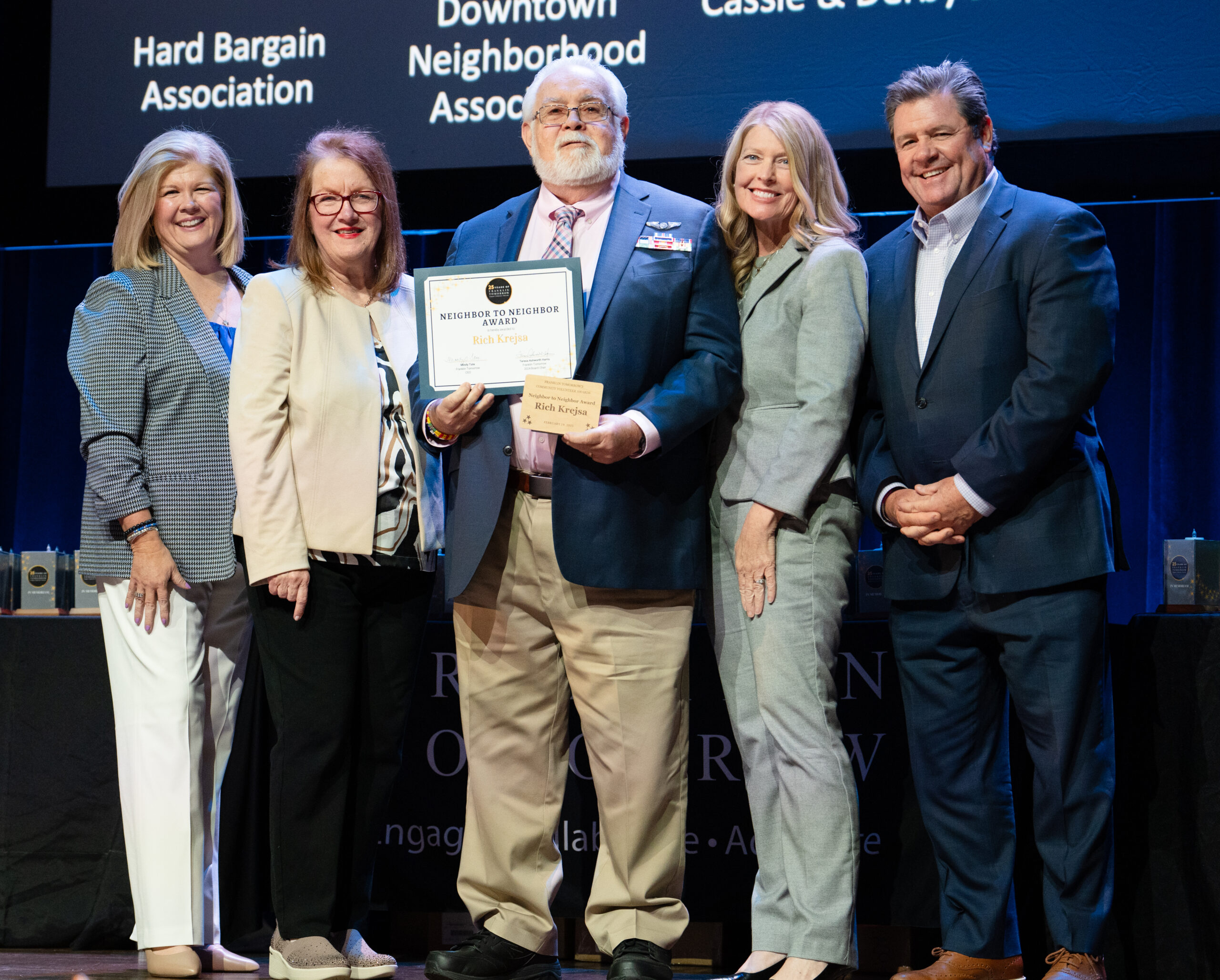 - Teresa Ashworth Harris, Mindy Tate, Rich Kresja, and Cassie and Derby Jones pose for a photo at Franklin Tomorrow’s 18th annual Volunteer Awards ceremony on Monday, March 24, 2025 at the Franklin Theater. Kresja was nominated for the Neighbor to Neighbor Award by Cassie and Derby Jones.