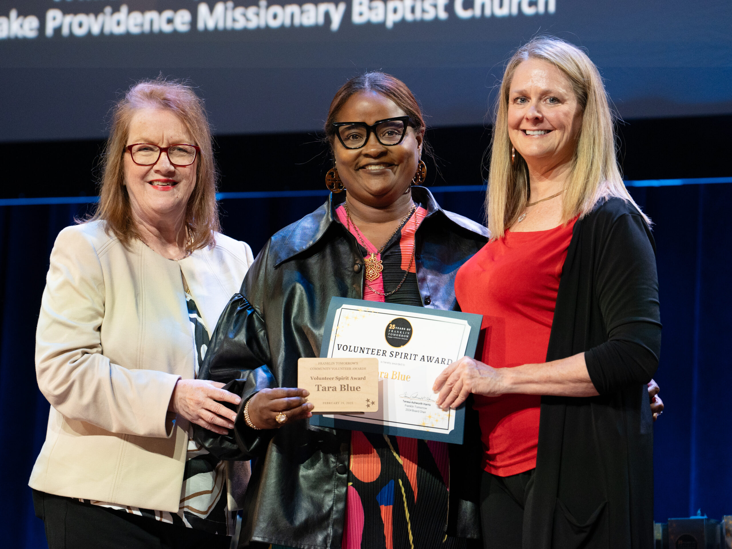 - Mindy Tate, Tara Blue and Peggy Kidd pose for a photo at Franklin Tomorrow’s 18th annual Volunteer Awards ceremony on Monday, March 24, 2025 at the Franklin Theater. Blue received the Volunteer Spirit Award for her work with the Black Business Coalition and other organizations.