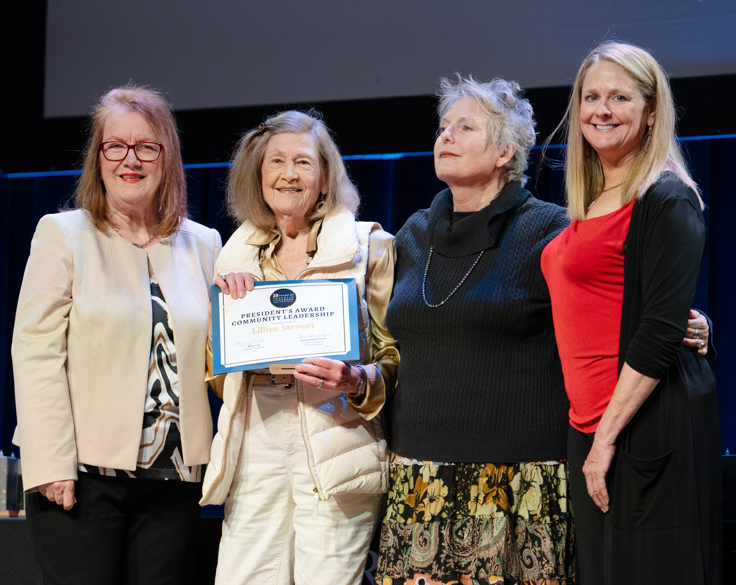 - Minday Tate, former Mayor Lillian Stewart, Pam Lewis and Peggy Kidd pose for a photo at Franklin Tomorrow’s 18th annual Volunteer Awards ceremony on Monday, March 24, 2025 at the Franklin Theater. Stewart received the Community Leadership Award for her service to the city.