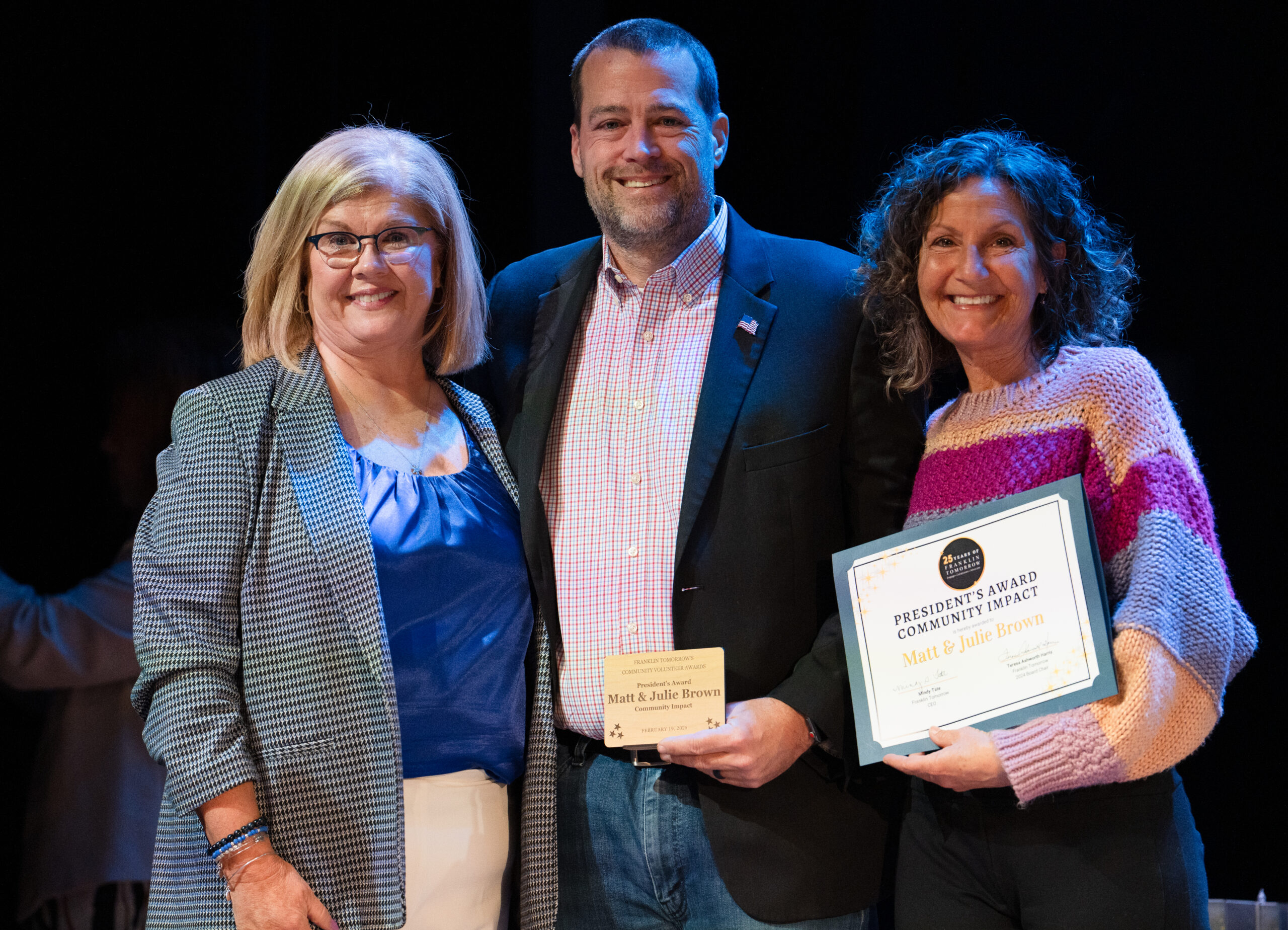 - Teresa Ashworth Harris and Matt and Julie Brown pose for a photo at Franklin Tomorrow’s 18th annual Volunteer Awards ceremony on Monday, March 24, 2025 at the Franklin Theater. The Brown’s received the Community Impact Award for their revitalization of the Franklin post office.