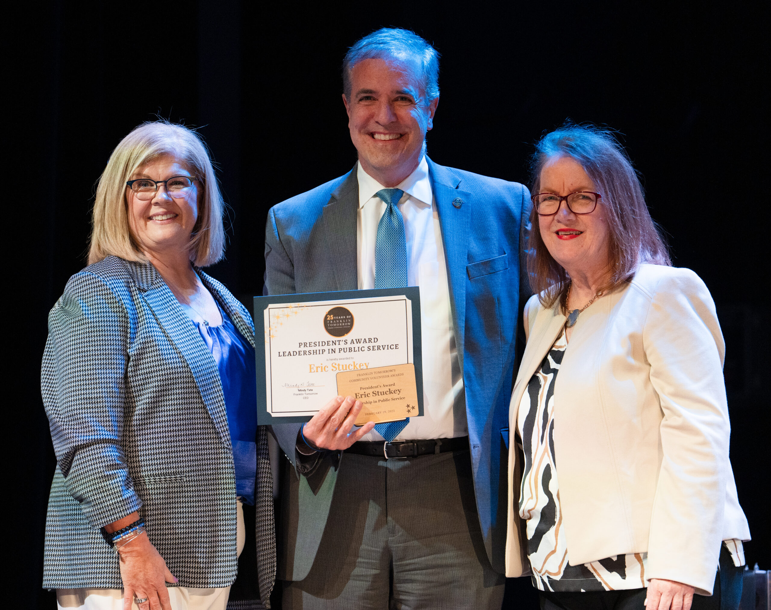 - Teresa Ashworth Harris, City Administrator Eric Stuckey and Mindy Tate pose for a photo at Franklin Tomorrow’s 18th annual Volunteer Awards ceremony on Monday, March 24, 2025 at the Franklin Theater. Stuckey received the Leadership in Public Service Award.