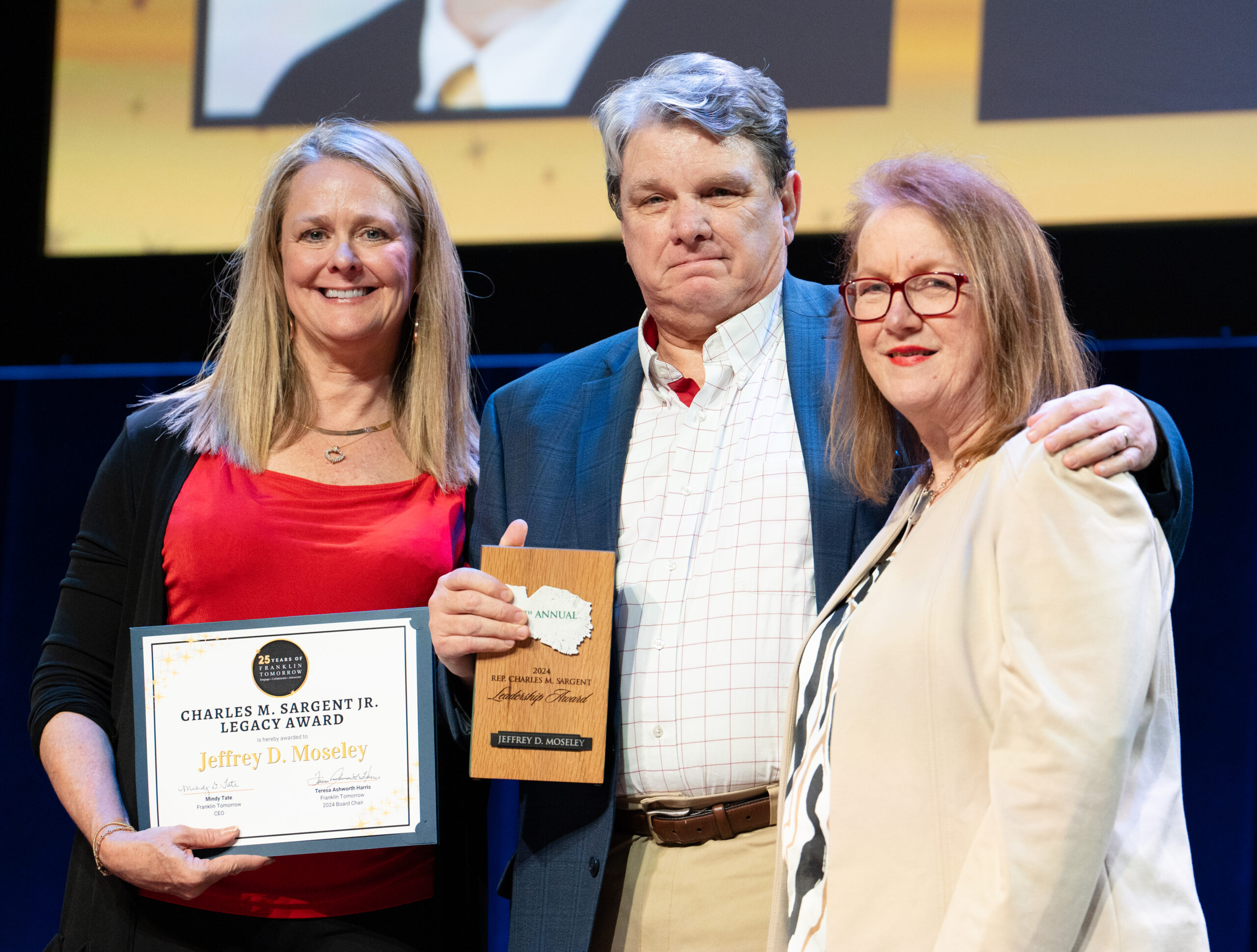 - Board Chair Peggy Kidd, Jeff Moseley, and Executive Director Mindy Tate pose for a photo at Franklin Tomorrow’s 18th annual Volunteer Awards ceremony on Monday, March 24, 2025 at the Franklin Theater. Moseley was awarded the Charles M. Sargeant Legacy Award.