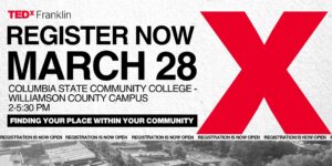 TEDx Franklin will be Saturday, March 28, 2026, from 2-5:30 p.m. in the theater located in the Arts & Technology Building at the Columbia State Community College, Williamson Campus, located at 1228 Liberty Pike in Franklin.